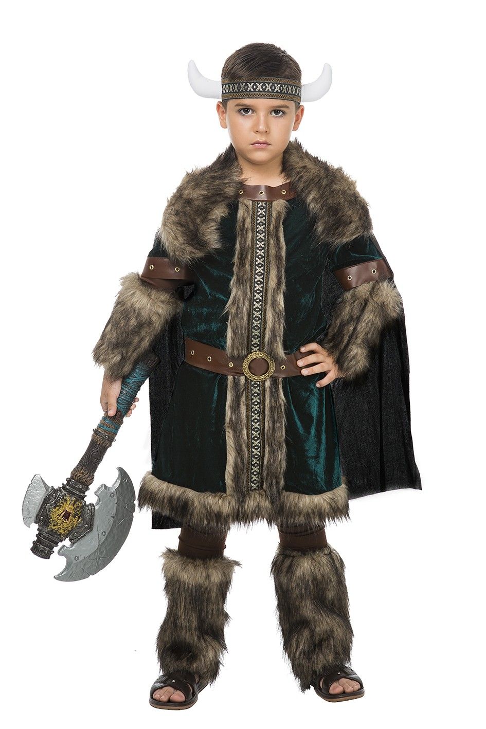 Contenido: Cinta de la cabeza con cuernos, vestido, mangas, brazaletes, perneras, grabas, cinturón y capa con hombreras.